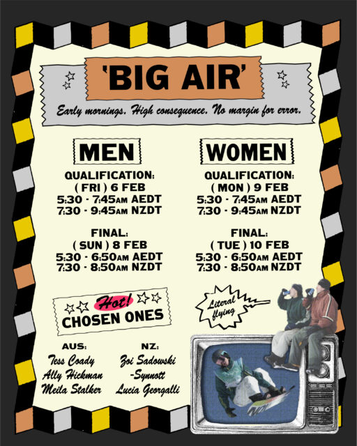The Chosen Ones are ready, the circus is fast approaching, and the golden voices of southern hemi snowboarding are sharpening their adjectives in anticipation for the greatest show on earth. Livingo is about to mess with our sleep cycles – but we’re here for it and ready to rip right in. Get the Nescafe on the brew, here’s your one stop guide to when and who to watch at the 2026 Winter Olympics.