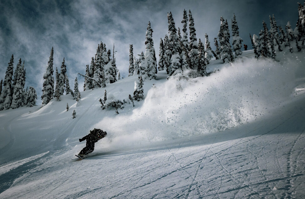 Overnight the weather rolled in and Baldface flipped the switch. Visibility dropped, snow started stacking, which at Baldface means you go and hide in the trees. Storm riding here is its own reward – turns on tap, everything muted and quiet, pow sticks floating on top of interior BC’s world famous snow.